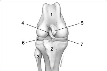 In more severe chronic cases, the "shock absorbers" of the knee -- quarter-moon shaped sections of cartilage called the medial and lateral menisci -- tear or become crushed because of exposure to abnormal stress that occurs when the knee is loose. Animals with this condition often are severely lame and may not be able to put any weight on the affected leg.
